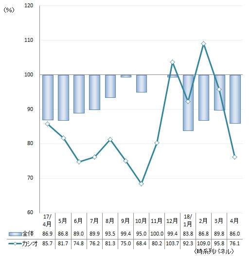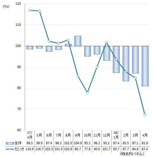 一方、コンデジ全体の販売金額では、17年の年末を境に1ケタ割れが色濃く現われたが、販売台数と比べると、若干、落ち着いている感はある。ただ、今年に入ってからは、2ケタ割れが鮮明化していく。そうしたなか、カシオは17年4月から8月まで前年同月を上回ったほか、需要が最も見込める12月も微増となった。ただ、今年に入ってからは停滞し、直近の4月では前年同月比67.4%と大きく後退した。