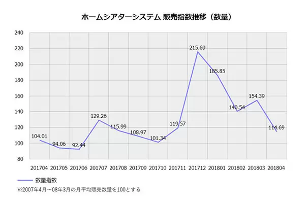 2007年4月~08年3月の月平均販売数量を100とした場合の販売台数指数の推移では、17年7月以降で100以上の数値を継続。とくに17年12月は200を超える高い値をマークしている。