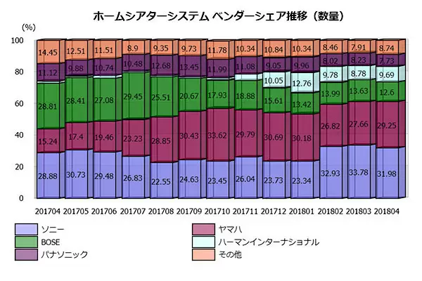 17年4月~18年4月のベンダー別販売台数シェアの推移をみると、ヤマハの大幅なシェア拡大が目にとまる。この1年で数値は約2倍まで上昇。逆にその影響でボーズのシェアが半減している。