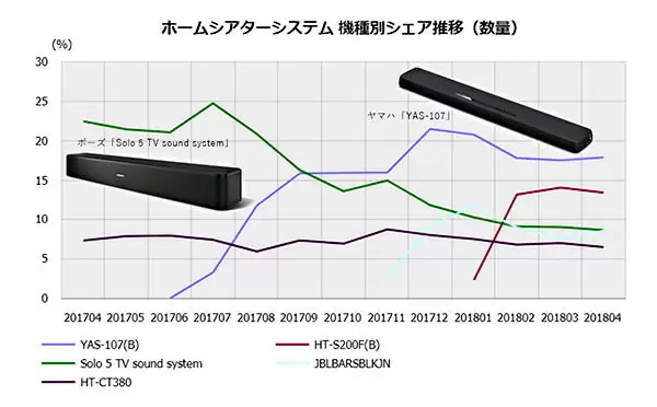 メーカーシェアの変動は機種別の上位5機種の販売動向を如実に反映している。ボーズの「Solo 5 TV sound system」は16年4月の発売以来、トップに君臨していた人気モデルだったが、17年10月に陥落。入れ替わるようにヤマハの「YAS-107」が首位に躍り出て、20%前後の安定したシェアをキープしている。
