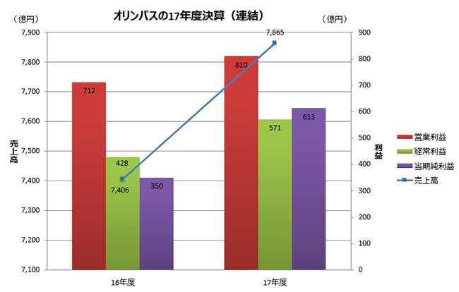 オリンパスは5月11日、2018年3月期(17年4月~18年3月)の決算を発表した。売上高は7865億円で前期比6.2%増、営業利益は810億円で13.8%増、純利益は570億円で33.4%増。売上構成比の約8割を占める医療事業が好調で全体の数字を押し上げ、増収増益を達成した。しかし、その裏で広告塔ともいえるデジタルカメラ(デジカメ)を含む映像事業は売上高が608億円の前期比4.0%減、営業損益は12億円のマイナスと苦戦した。