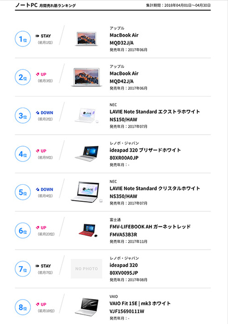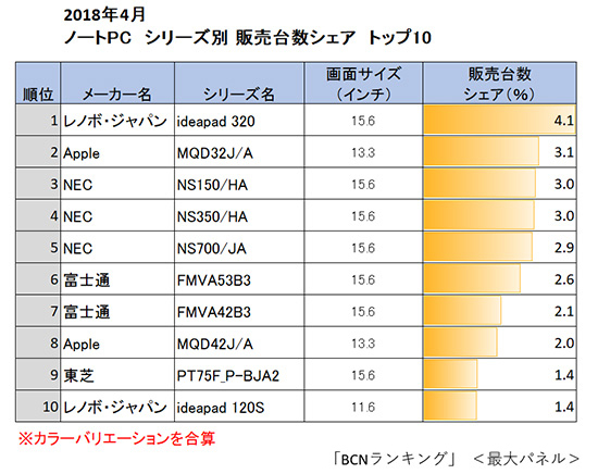 家電量販店・オンラインショップの実売データを集計した「BCNランキング」によると、カラーバリエーションを合算した2018年4月のノートPCのシリーズ別販売台数1位はレノボの「ideapad 320」、2位はAppleの「MacBook Air(MQD32J/A)」で、3位~5位には17年7月に発売したNECの「LAVIE Note Standard」シリーズの旧機種が並んだ。