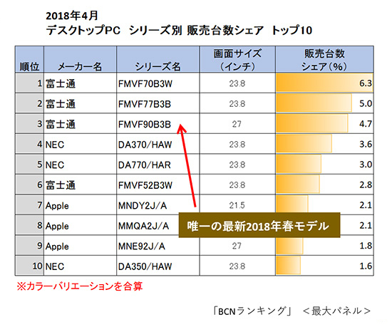 富士通の「ESPRIMO FHシリーズ」の「FMVF90B3B」は、今回、ノートPC/デスクトップPCのトップ10内に入った中では、唯一の最新18年春モデル。国内メーカーのPCのモデルチェンジは、基本的に春・夏・秋の年3回だが、現状は、必ずしも最新モデルではなく、価格のこなれた1~2シーズン前の製品のほうが人気を集めている。