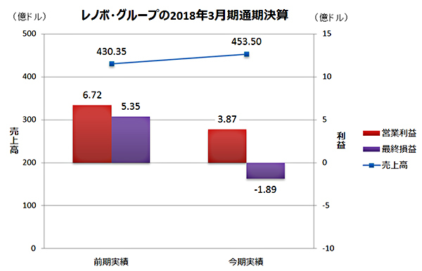 中国のPCメーカー大手、レノボ・グループは5月24日、2018年3月期(17年4月1日~18年3月31日)の通期決算を発表した。売上高は453億5000万ドル(前年同期比5%増)、営業利益は387億ドル(同42%減)、最終損益は189億ドル(約207億円)の赤字だった。