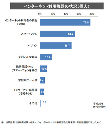 総務省が5月25日に発表した「平成29年通信利用動向調査」によると、インターネット接続機器で個人のスマートフォンの割合が54.2%と、PCの48.7%を上回った。
