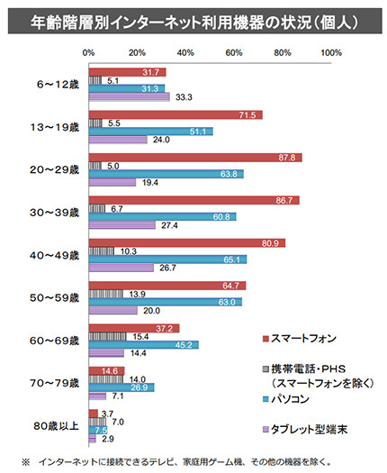 1位のスマホ、2位のPC以外では、タブレット端末が18.7%、携帯電話・PHSが10.6%、家庭用ゲーム機が7.4%、インターネットに接続できるテレビが5.9%と続いた。
