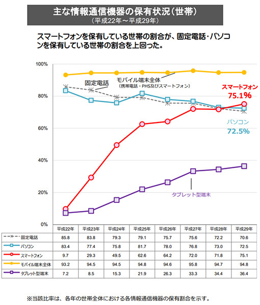 さらに、2010~17年の主な世帯別情報通信機器の保有状況では、17年のスマホを保有している世帯の割合は75.1%で、72.5%のPCをわずかながら上回った。タブレット端末も増加傾向にある。