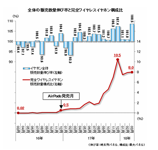 全国の主要家電量販店・ネットショップの実売データを集計した「BCNランキング」でも、アップルからAirPodsが発売された2016年12月に、わずか0.5%にすぎなかった完全ワイヤレスイヤホンの販売台数構成比は、1年後には10倍の10.5%に急拡大した。17年夏以降に参入メーカーが急増し、約30社まで拡大したことが大きい。「昨年の年末商戦に一気に盛り上がった」と山本主任も手ごたえを感じている。