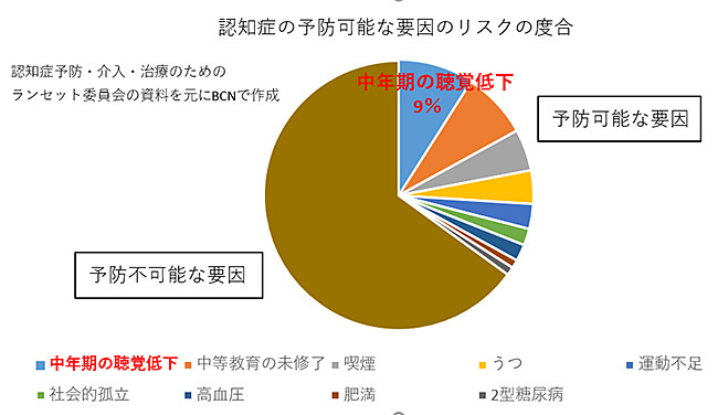 渋谷 さまざまにありますが、最近の研究で明らかになったのは「認知症」にもつながる可能性があるということです。医学の世界で国際的に権威がある英国ランセット委員会による調査では、予防可能な認知症リスクとして、45~65歳の中年期では高血圧や肥満を抑え、難聴が第一の要因としてあげられています。
