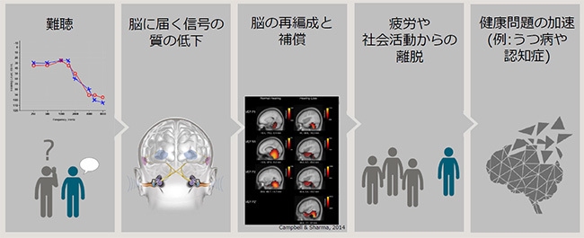 最近の研究では、聴力の低下を放置しておくと視覚などほかの感覚を司る脳領域が、本来ならば聴覚を処理していた領域に取って代わることが報告されています。これは、脳の可塑性と呼ばれる現象であり、喪失したほかの感覚を代償しようとする脳の傾向を反映したものです。