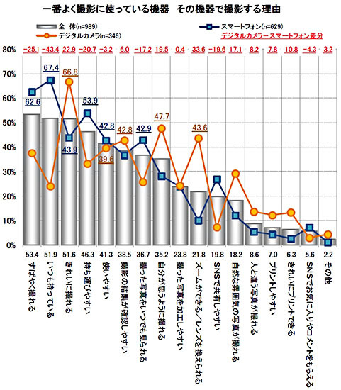撮影時にデジカメを一番よく使う層とスマホを一番よく使う層に分け、なぜその機材を使うかについて聞いたところ、デジカメでは「きれいに撮れる」が66.8%とトップ。以下は「自分が思うように撮れる」(2位、47.7%)、「ズームができる/レンズを換えられる」(3位、43.6%)と続いた。一方、スマホでは、「いつも持っている」が1位で67.4%、「すばやく撮れる」(2位、62.6%)、「持ち運びやすい」(3位、53.9%)と続いた。デジカメを一番よく使う層は、じっくりときれいな写真を思うように撮りたいと考えている一方、スマホでは、いつでも思い立ったときにすぐ撮れることを重視してことがわかった。