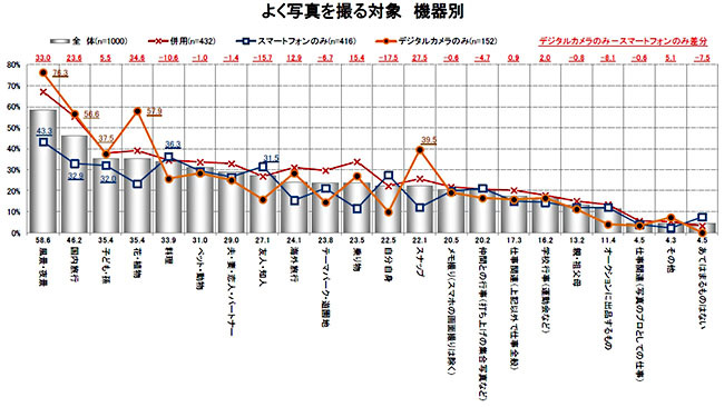 撮影の動機に関してはさらに違いが明確。デジカメのみの層では、1位が「旅行で撮る」(49.3%)、以下「撮りたいものがある」(2位、48.7%)、「撮ることが好き」(3位、48.0%)と続いた。一方スマホのみの層は1位が「撮りたいものがある」(49.3%)で、以下「日常生活の記録」(2位、44.3%)、「撮ることが好き」(3位、29.3%)と続いた。3位はいずれも「撮ることが好き」ではあったが、デジカメのみの層が18.7ポイントも高く、より趣味性が高いことがうかがわれる。一方、スマホが記録ツールとしてとらえられていることもわかった。