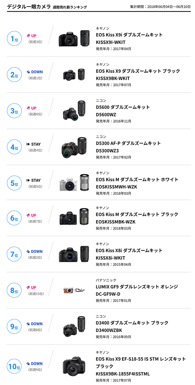 「デジタル一眼カメラ」は、前週3位だったキヤノンの「EOS Kiss X9i」のダブルズームキットがトップに。標準ズームレンズ「EF-S18-55mm F4-5.6 IS STM」と望遠ズームレンズ「EF-S55-250mm F4-5.6 IS STM」が付属し、実勢価格は10万円前後、店舗によっては10万円以下と、発売から1年ほど経ち、値ごろ感が高まっている。