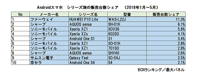 シリーズ別販売台数1位は、ファーウェイの「HUAWEI P10 lite」で、シェアは11.3%。2位につけたシャープの「AQUOS sense」が6.1%なので、人気は圧倒的といえるだろう。大手キャリアの取り扱いのないSIMフリースマホであり、それでいて1位というインパクトは大きい。