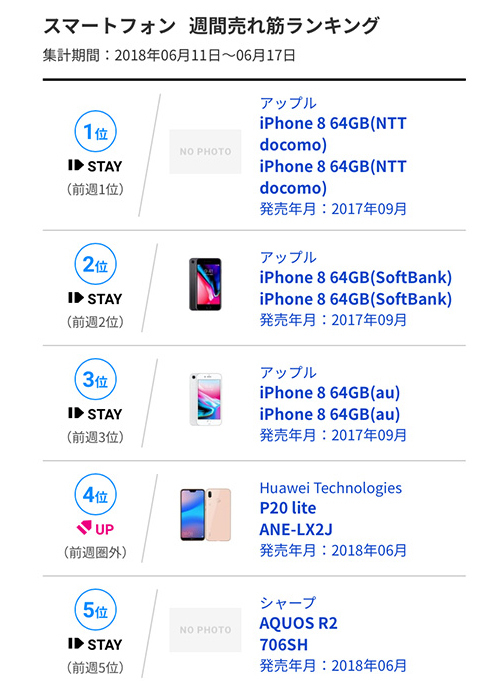 トップ3は前週と同じで、ドコモ、SoftBank、auの順で「iPhone 8」が並び、5月、6月発売の夏モデルでは、「AQUOS R2 706SH」や「ZenFone 5Z(ZS620KL)」「arrows Be F-04K」が好調だ。