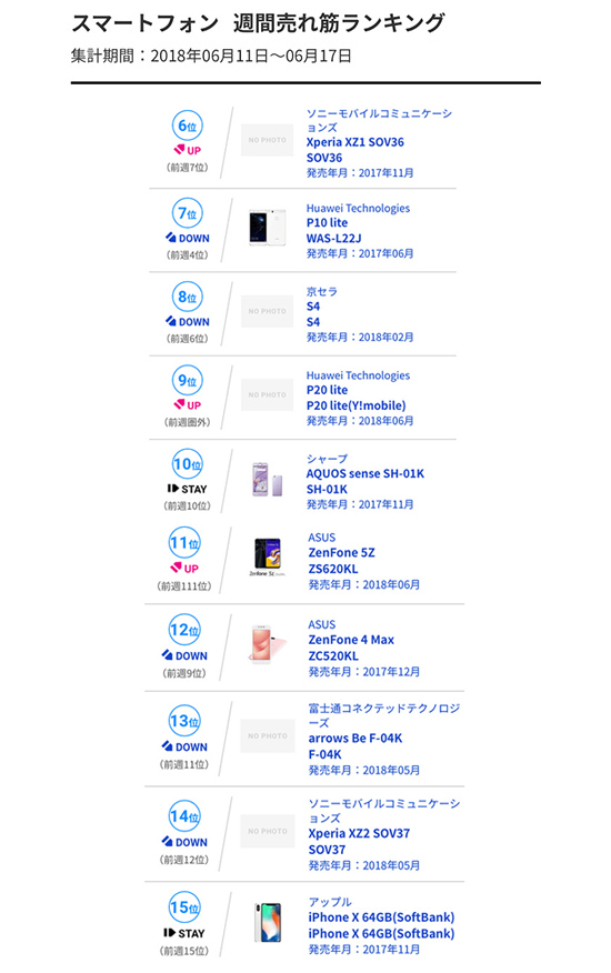 今回からダブルレンズカメラにスペックアップした「HUAWEI P20 lite」は、複数のキャリアが取り扱い、9位にはY!mobile(ワイモバイル)が販売するSIMフリー版、47位にはストレージ容量64GBのau版が入っている。