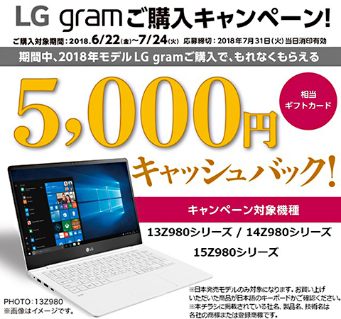 「LG gramご購入キャンペーン」では、期間中に対象機種を購入し、キャンペーンサイトで必要事項を記入して購入機種名の記載のあるレシートの画像を添付して応募すると、もれなく全員に5000円相当のギフトカードを贈呈する。専用応募封筒でも受け付ける。応募締切は7月31日当日消印有効。