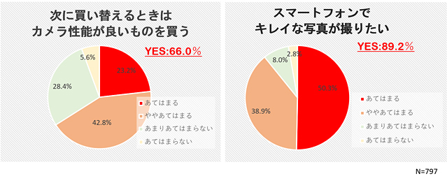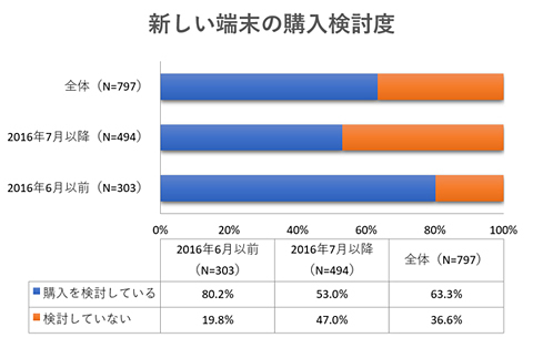 BCNが6月にインターネット上で実施した調査によると、週に1回以上、スマホで写真を撮影すると回答した20~59歳の男女797名のうち、「真剣に買い替えを考えている」「買い替えを考えている」「少し買い替えを考えている」をあわせ、63.3%が買い替えを検討しており、前回の端末購入から2年以上経過している人(2016年6月以前に購入した人)に限ると80.2%と、かなり買い替え意向は高かった。