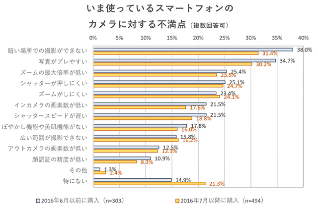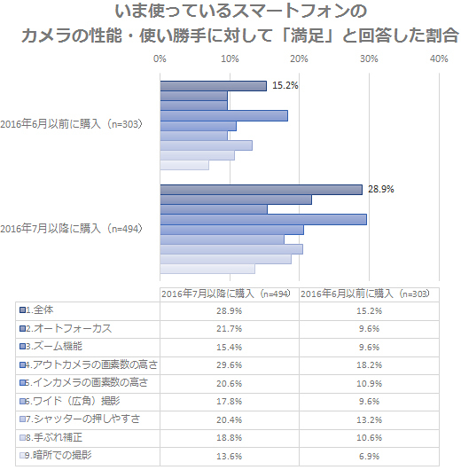 いま使っているスマホのカメラの性能・使い勝手について、満足/やや満足/やや不満/不満の4段階で評価してもらうと、前回の端末購入から2年以上経過している人(2016年6月以前に購入した人)よりも、まだ2年以上経っていない人(2016年7月以降に購入した人)のほうが「満足」と回答した割合は高く、なかでも「オートフォーカス」は、10ポイント以上の開きがあった。