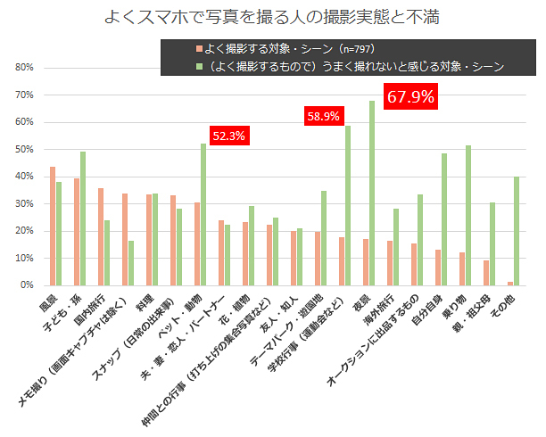 続いて、スマホでよく撮影する対象・シーンを聞くと、「風景」「子ども・孫」「国内旅行」「メモ撮り」「料理」「スナップ」「ペット・動物」の順だった。そのなかで「あまりうまく撮れていないと感じる対象・シーン」では、67.9%で「夜景」がトップ。運動会などの「学校行事」も58.9%と高く、「ペット・動物」「乗り物」「子ども・孫」は、4割以上が難しいと感じているとわかった。