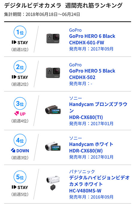 例年、夏はアクションカメラの販売が伸びる時期。直近の6月第3週の「デジタルビデオカメラ」のランキングでは、最新の「GoPro HERO 6 Black(CHDHX-601-FW)」が1位、前機種「GoPro HERO 5 Black(CHDHX-502)」が2位につけており、GoPro人気は健在だ。