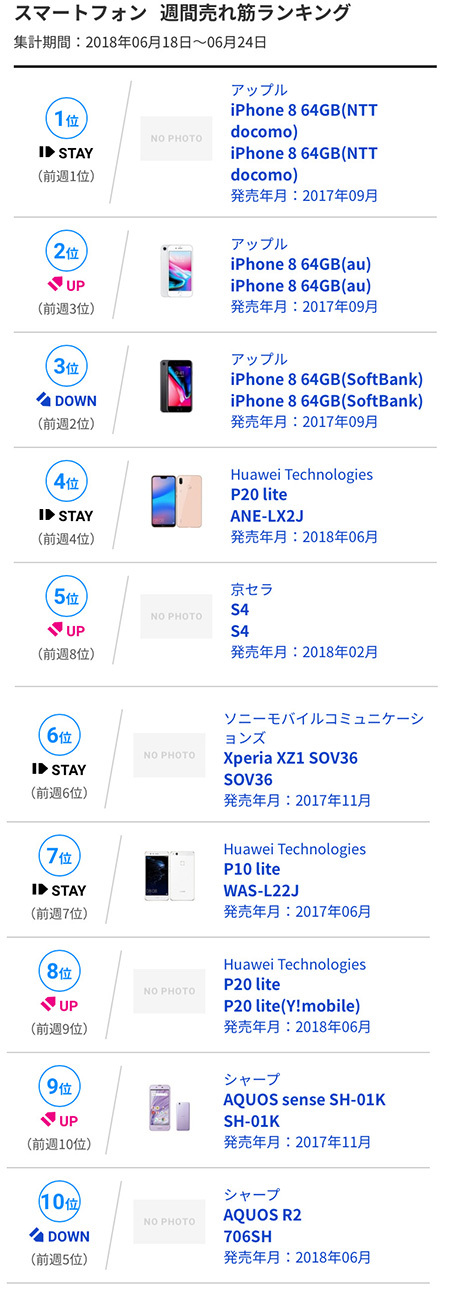 「スマートフォン」は、2位と3位が入れ替わり、6位に前週8位だったAndroid Oneのスマートフォン「S4」がランクイン。6月15日発売の「HUAWEI P20 lite(ANE-LX2J)」は4位をキープし、同機種のワイモバイル版「HUAWEI P20 lite」も8位に食い込んだ。