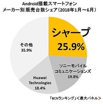 2017年のAndroid搭載スマートフォン年間販売台数No.1メーカーだったシャープが、18年上半期(1月~6月)も首位をキープした。全国の家電量販店の実売データを集計した「BCNランキング」によると、シェアは25.9%。2位のソニーモバイルコミュニケーションズに6.1ポイントの差をつけて、トップに立っている。