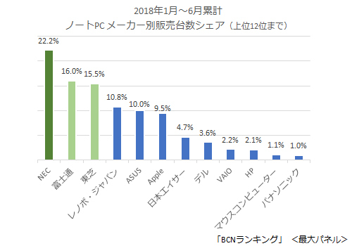 主力のノートPCに焦点をあてると、10年前(https://www.bcnretail.com/news/detail/080818_11506.html)は、NEC、東芝、富士通の3社が競い合い、少し離れてソニー(現VAIO)が追いかけるという構図だった。直近の2018年1月~6月の累計でも、トップ3の顔ぶれは変わらないものの、NECがシェア22.2%で一歩リード。富士通(16.0%)、東芝(15.5%)と続き、上位3社だけでシェア5割超を占める。