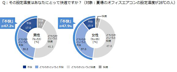 実態調査によれば、28℃設定にしているオフィスが19.8%、27℃以下が64.8%。しかも、オフィスが28℃設定のうち「不快」「どちらかというと不快」と回答したのが、男性47.2%、女性47.9%と、男女ともにほぼ半数だったという。そのうち、男女ともに4割以上は「蒸すから」が理由としている。そこで、ダイキンでは28℃設定で快適に過ごすために湿度のコントロールが重要と捉えている。