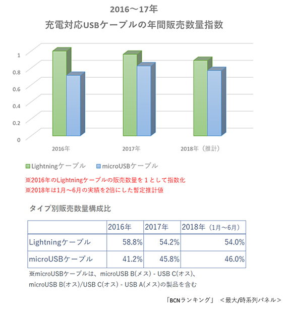 一方、USB Type-C対応のUSB充電ケーブルは、Androidスマートフォンのハイエンドモデルや薄型ノートPCなど、対応製品が増えた17年から売れ始め、今年は、前年を超えるペースで推移している。今後、もしiPhoneもUSB Type-Cに切り替えたら、販売状況は一変するだろう。