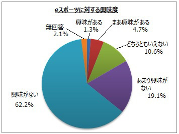 eスポーツについて、「どのようなものか知っている」と答えたのは18.5%。「名前を聞いたことはあるがどのようなものか知らない」は25.4%だった。eスポーツに対する興味では、「興味がある」「まあ興味がある」を合わせた「興味あり」はわずか6.0%にとどまり、「興味がない」「あまり興味がない」を合わせた「興味なし」は81.3%と、大半を占めた。