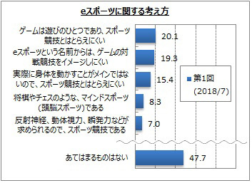 eスポーツに対する考え方としては、「ゲームは遊びのひとつであり、スポーツ競技とはとらえにくい」「eスポーツという名前からは、ゲームの対戦競技をイメージしにくい」「実際に身体を動かすことがメインではないので、スポーツ競技とはとらえにくい」がそれぞれ2割ずつに達した。一方、「反射神経、動体視力、瞬発力などの能力が求められるので、スポーツ競技である」という意見もあった。