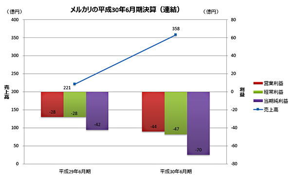 メルカリは8月9日、平成30年6月期(平成29年7月1日~平成30年6月30日)の連結決算を発表した。6月19日の東京証券取引所マザーズ上場以降、初めてとなる決算は、売上高が357億6500万円(前期比62.0%)、営業損益が44億2200万円の損失、経常損益は47億4100万円の損失、親会社株主に帰属する当期純損益は70億4100万円の損失。大幅に増収したものの、巨額の赤字を計上した。