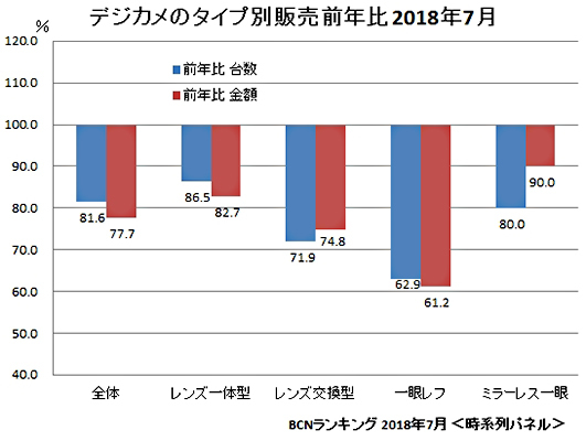 特に重傷なのが一眼レフだ。前年に比べ台数62.9%、金額61.2%と4割減の水準だ。一部のハイエンド需要を残して一眼レフは終息へ向かい始めている。カメラ市場で唯一とも言える頼みの綱はミラーレス一眼。キヤノンが満を持して投入したEOS Kiss初のミラーレスモデルが好調で市場をけん引し、3月~6月までの4か月は台数、金額とも前年を上回っていた。しかし7月には息切れし台数80.0%、金額も90.0%と5か月ぶりにそろって前年を割れた。