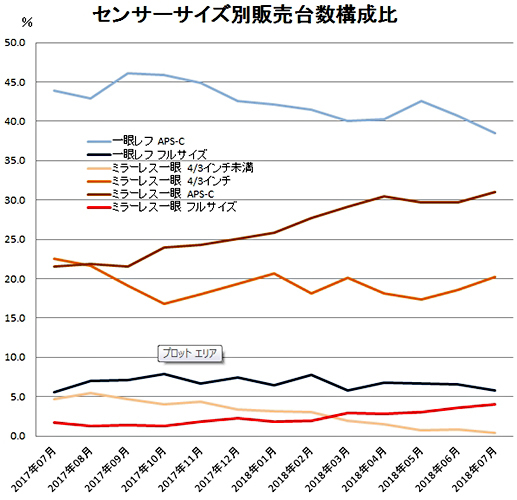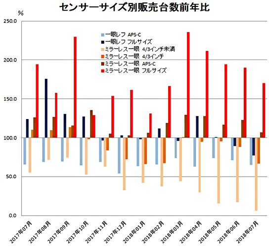 レンズ交換型デジカメのセクター別販売台数の伸びを見ると、伸びているのはミラーレス一眼のみ。そのうち、7月でも170.4%と大きな伸びを維持しているのはフルサイズセンサー搭載のミラーレス一眼だけという状況だ。「EOS Kiss M」の好調でAPS-Cセンサー搭載モデルは伸びている。販売台数構成比は31.0%と38.5%のAPS-C一眼レフに迫る勢いだ。しかし勢いはやや弱まってきた。税別の平均単価も8万円弱で、それほどうまみがある市場ではない。