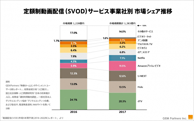 今回は競合のAmazonプライム・ビデオと比較しながら、Netflixの価格戦略に言及したい。GEM Partnersが今年2月に発表した調査によると、17年の市場シェアではdTVが20.3%でトップ、Huluが13.5%で続く。Netflixは7.1%で5位、プライム・ビデオは11.5%で4位だ。話題になりがちだが、現在の日本市場でNetflixとプライム・ビデオはツートップというわけではない。ではなぜ、この二つのサービスを取り上げるかというと、成長幅が大きいからだ。16年から17年でNetflixは2.8%、プライム・ビデオは5.6%上昇。他のサービスからシェアを奪っている。