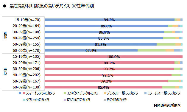 写真撮影をするために最も利用しているデバイスを聞いたところ、「スマートフォンのカメラ」が最も多く87.7%、次いで「コンパクトデジタルカメラ」が7.4%、「デジタル一眼レフカメラ」が2.4%と続いたという。性年代別に見ていくと、10代女性は「スマートフォンのカメラ」をメインで利用している割合が非常に高いことがわかったとしている。