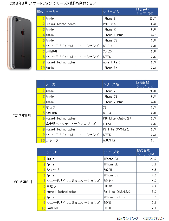 過去との比較では、前年同月比で114.5%、2年前の16年8月と比べると130.1%とさらにプラス幅が大きくなる。最も多く売れた一番人気の機種はAppleの「iPhone 8」で、シェアが22.7%。過去3年間のランキングトップ10を比較すると、17年8月は「iPhone 7」が25.0%。16年8月は「iPhone 6s」が21.2%で、それぞれトップだった。