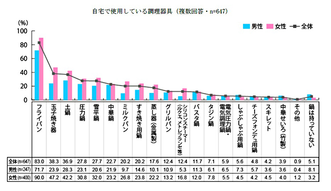 自宅で夕食を作っている人が使用している鍋は、「フライパン」が83.0%と最も高く、次いで「玉子焼き器(38.3%)」「土鍋(36.9%)」と続く。全体的に、男性に比べて女性の方が高い割合となっているという。なお、今回の定性調査でテーマとしていた「圧力鍋」の使用率は27.8%。「電気圧力鍋・電気調理鍋」は5.9%だったとしている。