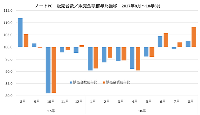 不調が続いていたノートPCに回復の兆しが見え始めている。2017年10月以降、販売台数が8か月連続で前年割れしていたが6月に回復。金額では3か月連続で前年を上回った。今回の上昇の特徴としてあげられるのが、販売金額が台数よりも高い伸びを示していることだ。安いモデルが大量に販売されているのではなく、高級モデルが売れ始めている。