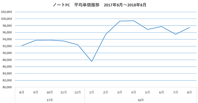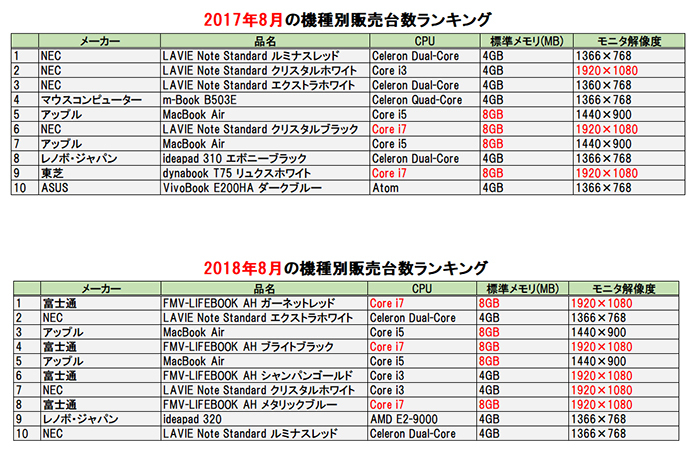 昨年8月は9万2115円だったが、今年8月は9万7488円となり5373円上昇。機種別の販売台数ランキング上位10モデルを比較すると、15.6型が売れているのは変わらないが、CPUでいえばCore i7、メモリでいえば8GBと人気製品のスペックが高性能化していることがわかる。
