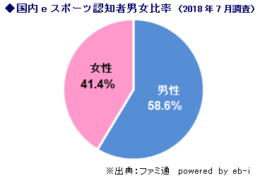 eスポーツを認知している回答者を性別でみると、女性が約4割を占めている。前回の結果では、女性の比率が3割だったことから、女性の間でも認知が拡大しているといえる。