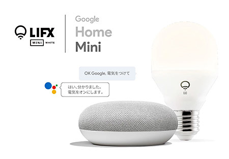 GA00210-JP+LIFXは、Google Home Miniを介した音声によるLIFX Mini Whiteの操作が可能。買い物帰りで両手が荷物でふさがっていても、キッチンのLIFX Mini Whiteをつけたり、布団の中から寝室のLIFX Mini Whiteを消したりと、IoT機器ならではの操作性が体験できる。