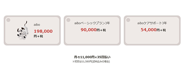 aiboワンワンプランは、aibo本体に加え、aiboが成長するために必要な「aiboベーシックプラン」とaiboの不具合や故障に備える「aiboケアサポート」を3年間かけて利用できる購入プラン。ベーシックプランやケアサポートの利用期間の3年に合わせ、初期費用を抑えて購入が可能。月額1万1000円を35回に渡って支払う。aiboワンワンプランを含むaiboの購入受付は、ソニーストアオンライン、全国5カ所のソニーストア直営店で行っている。