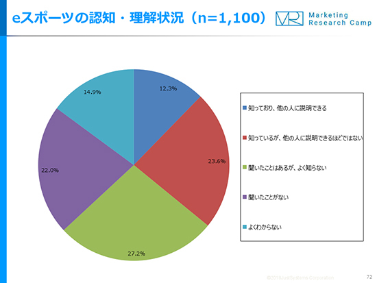 調査によれば、「eスポーツ」について、「知っており、他の人に説明できる」が12.3%、「知っているが、他の人に説明できるほどではない」が23.6%、「聞いたことはあるが、よく知らない」が27.2%だったという。合わせて63.1%が「聞いたことはある」と回答したことになる。徐々にではあるが、eスポーツの認知度は高まっている。