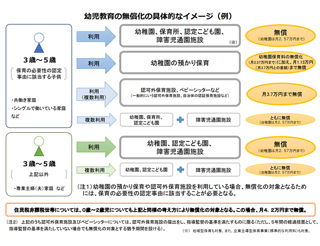 同じ19年10月からは、幼児教育・保育の無償化(幼保無償化)の実施が決定している。対象は、3~5歳の保育園・幼稚園・こども園に通う子ども全て。加えて、住民税非課税世帯の0~2歳児も無償化する。ただし、従来型の幼稚園や認可外保育園などに通う場合は、それぞれ上限額までの補助となる。