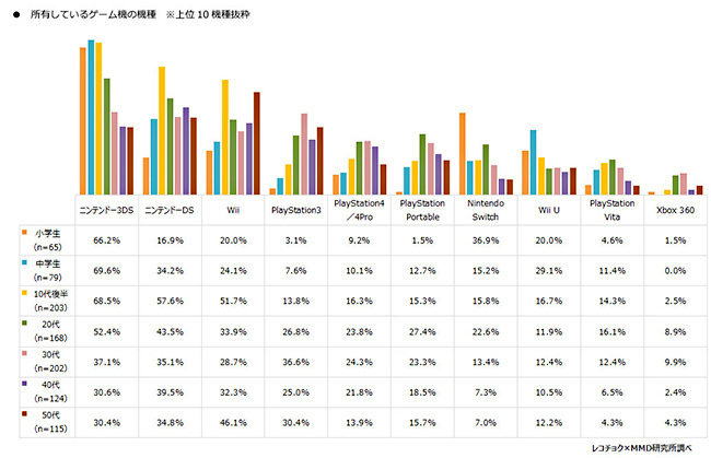 また、所有しているゲーム機は、小学生~30代で最も多かったのが「ニンテンドー3DS」、40代が「ニンテンドーDS」、50代が「Wii」だった。