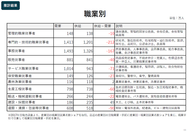 2番目に多いのは医療・福祉で187万人、次に卸売・小売で60万人と続く。職業別でみると、研究者や情報処理・通信技術者、医師、教員などの専門的・技術的職業従事者が212万人、事務従事者が167万人、運搬・清掃・包装など従事者が90万人不足すると推計している。