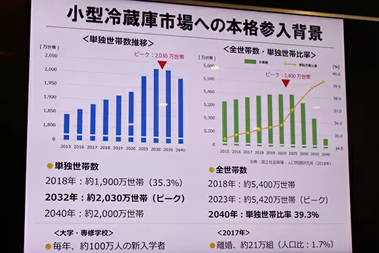 単独世帯向けの小型冷凍冷蔵庫に注力する理由について、プロダクトディレクション部の岡田剛マネージャーは、「人口減少が進んでいる中、世帯数は増加傾向にある。2040年には、単独世代が4割ほどになるという予測がある。また、一人暮らしをスタートする方は年間約21万人とされている。このような日本の状況にあわせた家電の需要は今後も続くだろうと考え、商品を考案している」と説明する。