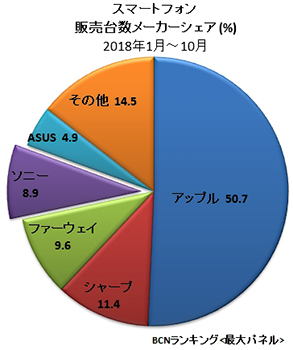 ソニーのスマホブランドと言えばXperiaだが、今年は特に販売が不調。赤字幅が拡大しているのもうなずける。アップルがダントツの強さを維持している日本市場でも、ソニーは2014年以降、何とか15%前後のシェアを確保しながら2位のポジションを維持してきた。しかし、17年、18年とシェアを下げ、今年は10月までの時点で8.9%と2ケタ割れ。ライバルのシャープばかりか、このところ勢いが増している中国のファーウェイにまで抜かれ、2ランクダウンの4位に甘んじている状況だ。